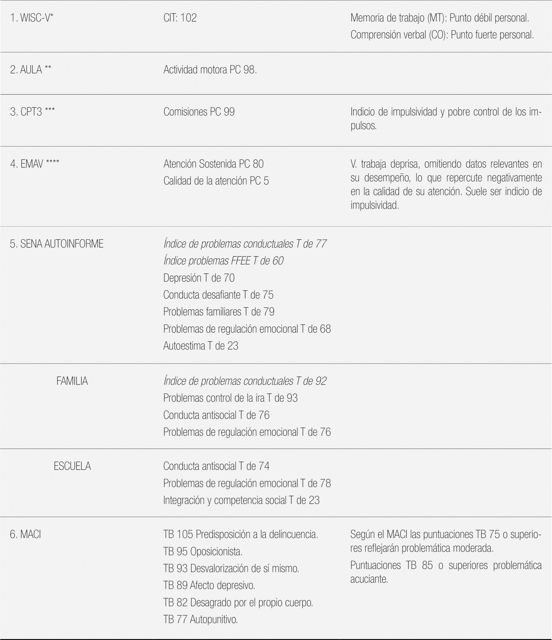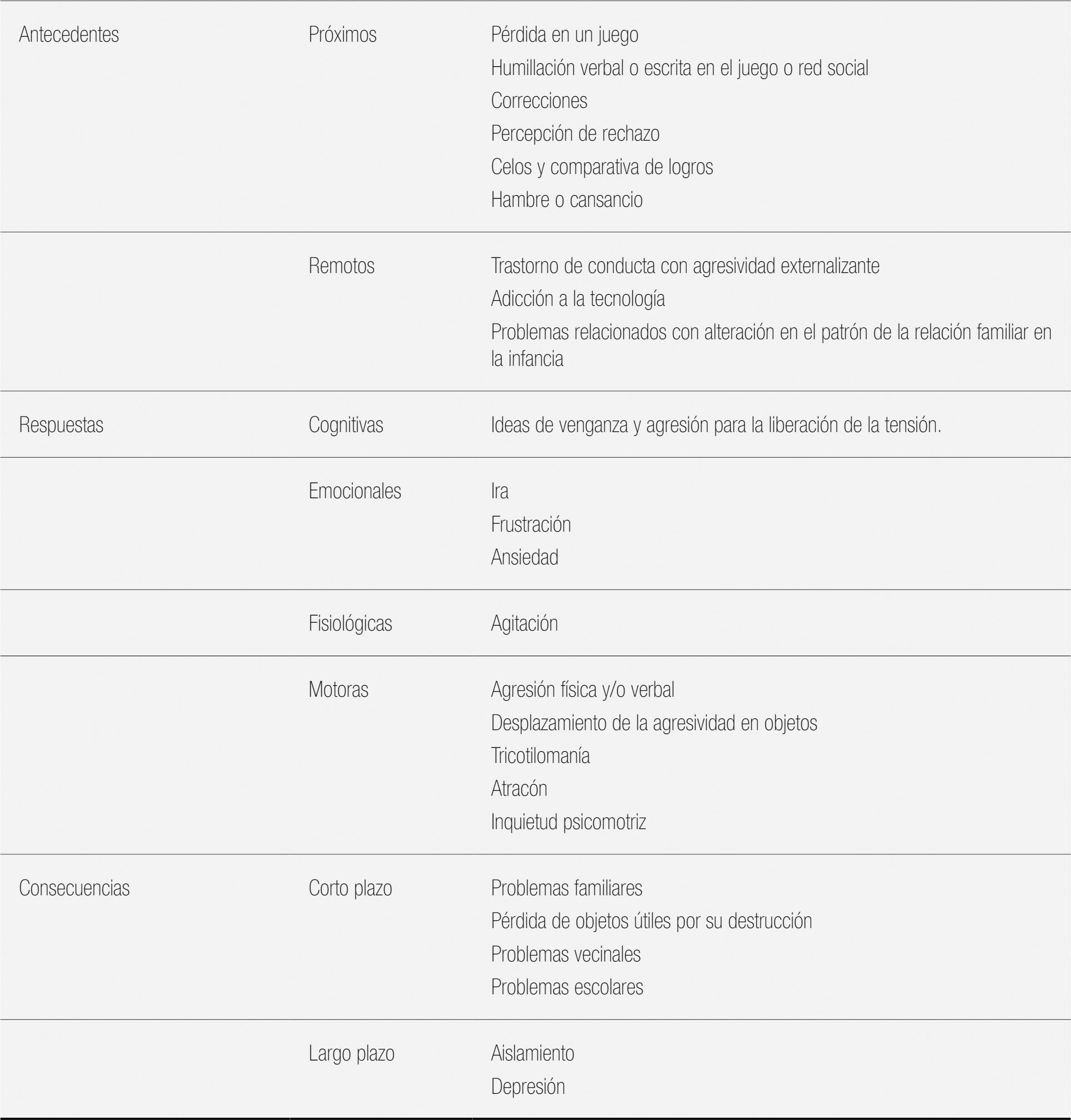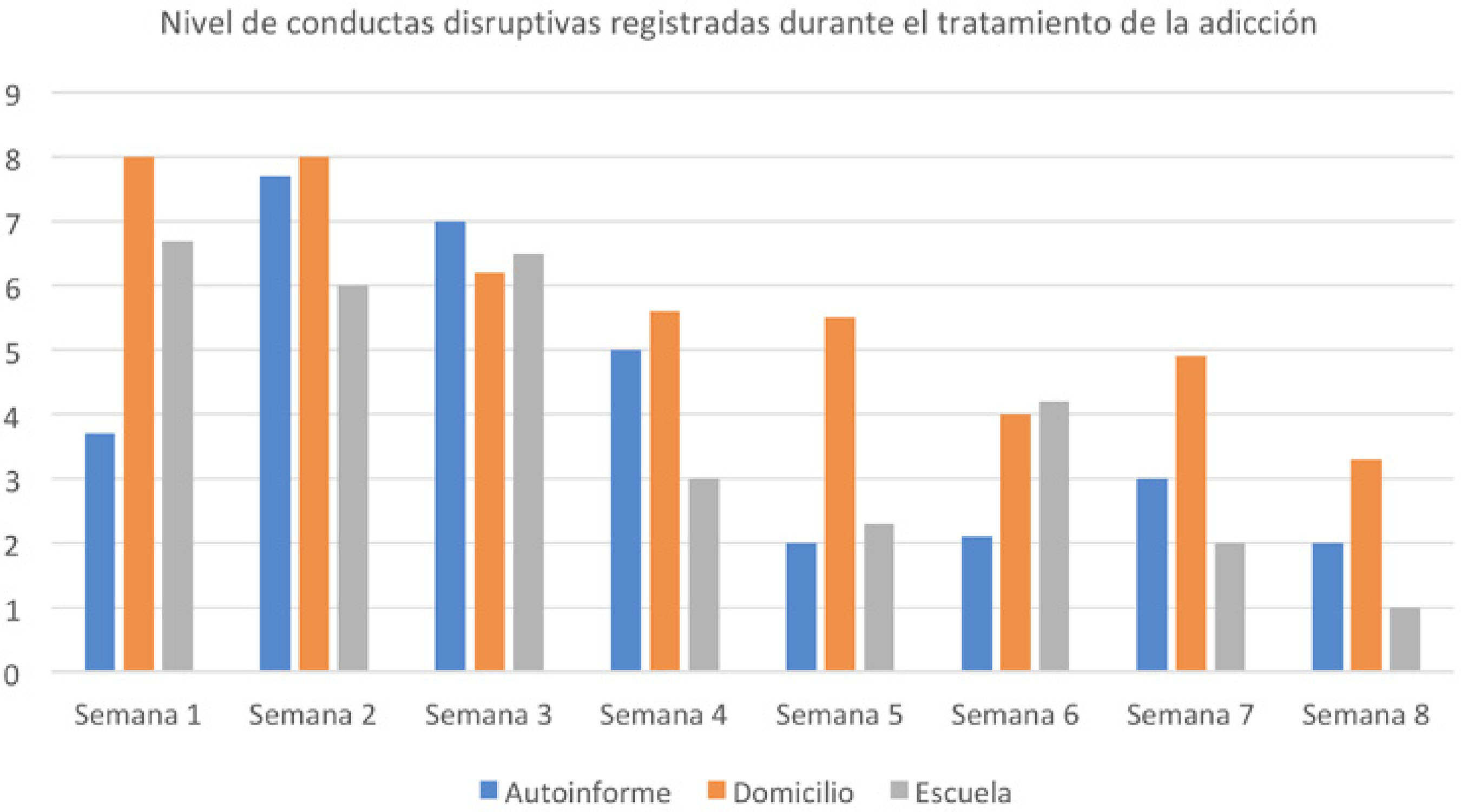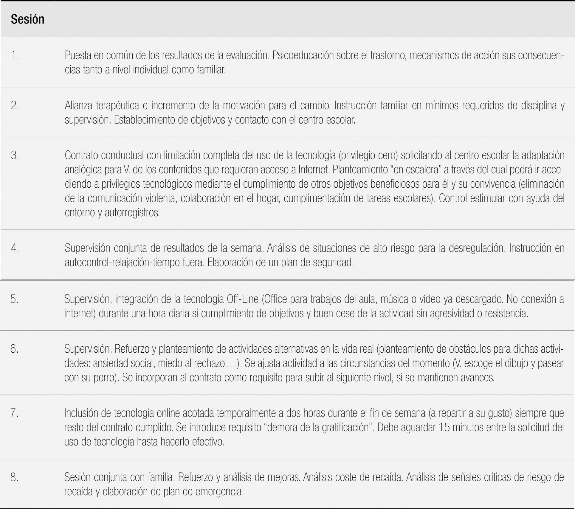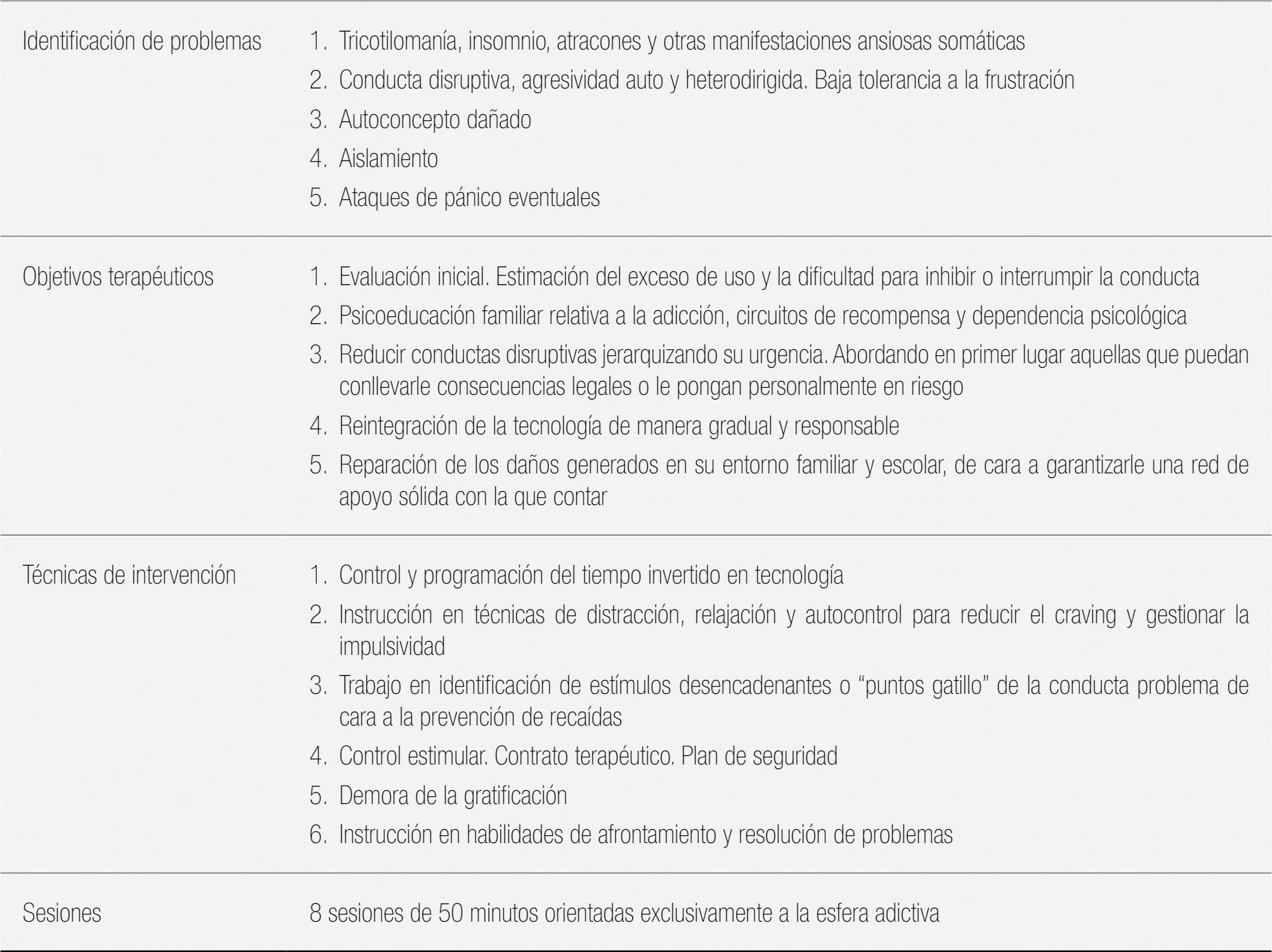 Intervención Como ya se ha reflejado en investigaciones previas como la de Landy et al. (2022) o Payá-López et al. (2023), el empleo de la Terapia Cognitivo-Conductual ha resultado ser eficaz para minimizar la adicción a videojuegos, así como abordar los síntomas que conlleva como depresión, ansiedad o aislamiento social, entre otros. Es importante señalar que, en el caso de V., la adicción a la tecnología supuso una parte del abordaje completo. No se detallará más profusamente el resto de su intervención por no estar relacionada con el tema en el que se centra este trabajo. No obstante, en paralelo y posteriormente al procedimiento que se detalla, fue preciso gestionar otras áreas dignas de atención tales como ciertos episodios de rechazo escolar que se encontraba vivenciando. Éstos se relacionaban con dificultades de cara a la vinculación adaptativa con los pares, recurriendo a la violencia siempre que devenía una situación frustrante, ostentando una pobre flexibilidad cognitiva y autocontrol. Además, durante la intervención con la adicción pudieron sentarse las bases para una mejor intervención en el área familiar, en la cual se intervino de manera específica una vez el uso compulsivo de tecnología reflejó mejoría. Mencionar, en lo relativo al abordaje de la esfera familiar, la importancia que ostentó la mejora de la comunicación entre los miembros a través del fomento de la mentalización sobre las cogniciones y emociones propias y ajenas. Se organizaron sesiones familiares posteriores al tratamiento que se procede a describir, a través de las cuales se fomentó la expresión de la rabia contenida y se conformó una narrativa clara y sincera sobre la separación, los motivos que llevaron a los progenitores a ello y la validación de las emociones que todo ello ocasionó en el menor. Se reflejan a continuación dos tablas en las cuales puede apreciarse, por un lado, un resumen general del encuadre terapéutico (Tabla 4) así como una intervención más detallada por sesiones (Tabla 5). Tabla 5 Intervención por sesiones Nota: Se refleja la intervención dividida en sesiones de psicoterapia mantenidas con el paciente de cara al abordaje exclusivo de la adicción a la tecnología El tratamiento se estructuró en varias fases (tabla 5), adaptando al caso del paciente la estructura propuesta por Chóliz y Marco (2012) en sus trabajos de adicción a Internet y redes sociales. Al inicio de cada sesión, se reservaba un tiempo para la puesta en común con la familia. Asimismo, se mantenía contacto periódico con su tutora para valorar avances o retrocesos en esa área. Se refleja a continuación la gráfica 1 relativa a la evolución de las conductas disruptivas percibidas por V., su familia y su centro escolar, durante las ocho semanas de intervención en el área de adicción a la tecnología. Dichos datos se obtuvieron de los autorregistros cumplimentados durante este tiempo en cualidad e intensidad de los comportamientos conflictivos. Se ofrece también un ejemplo de los mencionados registros, (Tabla 6 y 7). Gráfica 1 Evolución de las conductas disruptivas reflejadas en los autoinformes durante el tratamiento Resultados Al finalizar el tratamiento, V. realiza un re-test del cuestionario SENA (ver Tabla 8). Tabla 8 Comparativa pretest-postest de resultados en cuestionario SENA (Fernández-Pinto et al., 2015) tras 8 semanas de tratamiento En el autoinforme, V. experimenta un importante decremento de los problemas conductuales y una mejora en sus funciones ejecutivas. Asimismo, el estado de ánimo y la conducta desafiante mejoraron a su juicio tras la intervención. Los conflictos familiares continuaron vigentes hasta más adelante en el tratamiento. De parte de la escuela, se refleja también una importante evolución a nivel de regulación emocional e integración con el grupo de iguales. Persistiendo cierta tendencia a la desregulación emocional, algo más contenida. Donde menos resultados se aprecian es en el clima del hogar. Pese a ello, se refleja un descenso de los problemas conductuales y del control de la ira. Cabe señalar que los conflictos familiares eran un foco importante a trabajar en el caso que, como se ha indicado, tuvieron que ser abordados con posterioridad. V. logró una reintegración adaptativa de la tecnología en su vida, reduciendo significativamente la sintomatología compulsiva asociada (sobreingesta, tricotilomanía e insomnio). Si bien es cierto que continuaba experimentando un moderado nivel de excitación durante el uso prolongado de videojuegos, la agresividad inicial deja de estar presente logrando circunscribir sus reacciones al contexto del juego sin proyectar su agresividad en el entorno y autocontrolando mucho más las reacciones desencadenadas por la frustración que devenía de la pérdida de la partida o el cese del juego. Así, cabe destacar que V. logró enriquecer su vida diaria con actividades variadas al margen de la tecnología, logrando una distribución más equitativa de su tiempo online-offline. Como se comentaba al inicio del texto, el hecho de que las TIC se hayan abierto paso de forma ostensible en el día a día de las nuevas generaciones, implica un reto para profesionales, usuarios y familias de cara a fomentar e instaurar un buen uso de las mismas previniendo su abuso (Pedrero-Pérez et al., 2018). Tomando como referencia los resultados de la evolución del paciente, se pueden extraer conclusiones relacionadas con la intervención de esta problemática. Por un lado, parece que la fenomenología de este tipo de afecciones es similar a la de otros trastornos adictivos protagonizados por un deterioro en las relaciones interpersonales, académicas y desajustes emocionales. El paciente, como sucede en otros casos de adicción, requiere perpetrar conductas que suponen un perjuicio personal y se evidencia la pérdida de gobierno y razonamiento sobre dicho aspecto, asemejándose a un problema de dependenci