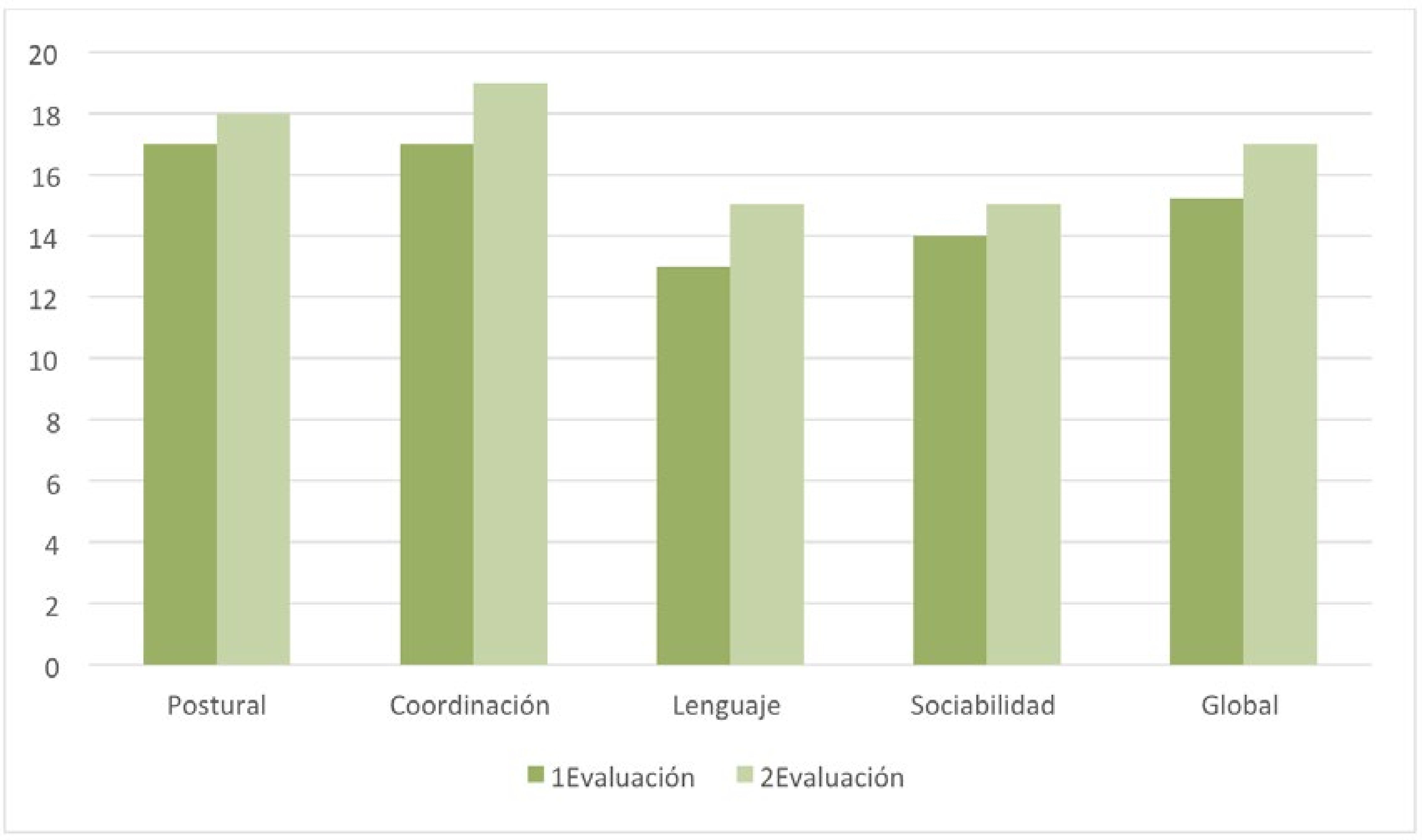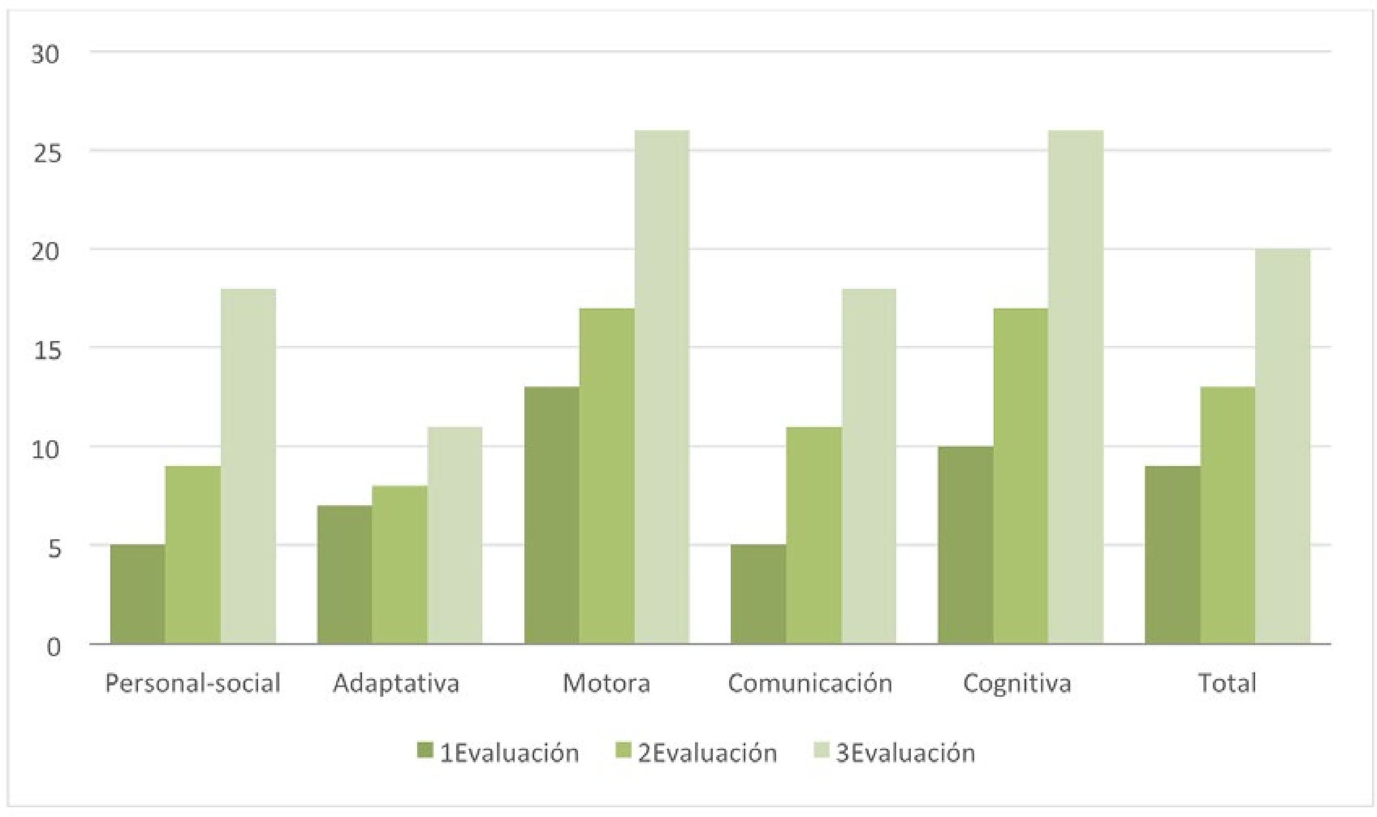 El síndrome de Potocki-Lupski (PTLS) es una enfermedad genética rara causada por una duplicación en el cromosoma 17 (17p11.2). El tamaño de la duplicación suele ser reducido (3.7 Mb aproximadamente) y el origen, en la mayor parte de las ocasiones, es de novo (Potocki et al. 2007, Zhang et al. 2010). Suele señalarse como principal responsable de la aparición del PTLS al gen RAI1 (del inglés Retinoic Acid Induced 1) (Lee et al., 2012), aunque se han identificado diversos genes que también pueden afectar (Potocki et al.2007, Yuan et al., 2015). El PTLS es un síndrome relativamente novedoso. Aunque a finales de la década de los 90 y principios del año 2000 ya se detectaron casos con la mencionada duplicación (Brown et al., 1995; Potocki, et al., 2000), no es hasta el año 2007 cuando en un nuevo estudio se profundiza en las características del síndrome, acuñando el nombre de la investigadora e investigador que dirigían el proyecto (Potocki et al, 2007). A partir de entonces, teniendo en cuenta a la población infantil, los trabajos que han ido apareciendo en la literatura científica lo han hecho principalmente desde la perspectiva genética (Potocki et al., 2007; Yuan et al., 2015), en la mayor parte son estudios de caso único (Bravo et al., 2013; Domenico et al., 2018; Fernández et al., 2016; McCool et al., 2017) y describen sobre todo aspectos clínicos. Los estudios llevados a cabo relacionados con la clínica del síndrome apuntan a unas características heterogéneas en cuanto a la sintomatología, presentándose, aunque no en todo los casos ni con la misma intensidad, rasgos faciales dismórficos (Lee et al., 2013; Martin et al., 2008; McCool et al., 2017; Potocki et al., 2007), retraso en el desarrollo (Lee et al., 2013; Potocki et al., 2007; Soler-Alfonso et al., 2010), hipotonía (Martin et al., 2008; Potocki et al., 2007; Soler-Alfonso et al., 2010), discapacidad intelectual (Martin et al., 2008; Potocki et al., 2007; Soler-Alfonso et al., 2010; Treadwell-Deering et al., 2010) alteraciones en el sueño (Potocki et al., 2007), dificultades en la alimentación (Martin et al., 2008; Potocki et al., 2007; Soler-Alfonso et al., 2010; Yuan et al., 2015), problemas en el lenguaje (Lee et al., 2013; Lee et al., 2012; Martin et al., 2008; McCool et al., 2017; Potocki et al., 2007; Yuan et al., 2015), anomalías congénitas (Bravo et al., 2013; Martin et al., 2008; Potocki et al., 2007; Yuan et al., 2015) y alteraciones en el comportamiento y sociales, llegando en algunos casos a presentar sintomatología relacionada con trastornos del espectro autista (Martin et al., 2008; McCool et al., 2017; Potocki et al., 2007; Treadwell-Deering et al., 2010; Yuan et al., 2015). En la Tabla 1 se resumen los signos y síntomas comunes en el síndrome de Potocki-Lupski, así como la frecuencia con la que suelen observarse (Domenico et al., 2018; GARD, 2018; Potocki et al. 2007; Treadwell-Deering et al., 2010). Tabla 1 Sintomatología y frecuencia de presentación en el síndrome de Potocki-Lupski a Los rasgos faciales en la mayoría de los pacientes no son estrictamente dismórficos. Sin embargo, presentan muchas características similares. Fuentes: Domenico et al., 2018; GARD, 2018; Treadwell-Deering et al. 2010 En relación a la prevalencia del síndrome no se han hallado datos concretos, ni a nivel general ni a nivel de población española en particular. Se le considera una enfermedad rara ya que su incidencia se estima en 1 caso por cada 20.000-25.000 nacidos (Bissell et al., 2018; Treadwell-Deering et al., 2010) pero también se apunta a la posibilidad de que exista un infradiagnóstico (Potocki et al., 2000). La asociación de padres y madres de niños diagnosticados en España con el síndrome Potocki-Lupski nos informa que en octubre de 2018 son veintinueve familias las que habían establecido contacto con ellos, concretamente padres de 13 chicos y 16 chicas. A nivel de intervención, los trabajos encontrados son escasos y refieren tratamientos según las características particulares del caso (McCool et al., 2017; Soler-Alfonso et al., 2010; Fernández et al., 2016) posiblemente debido, por un lado, a la baja frecuencia de publicaciones que hay de este síndrome en la infancia, y por otro a la heterogeneidad de la sintomatología. Tratándose de la atención a infantes, la Atención Temprana (AT) muestra ser una estrategia eficaz en la prevención y compensación de los efectos causados por los déficits ya sean por cuestiones evolutivas, biológicas o sociales (para más información véase Robles-Bello y Sánchez-Teruel, 2013). Y aunque no se han encontrado estudios en casos de Potocki-Lupski tratados con AT, ésta se muestra necesaria (Sánchez-Teruel, 2011), debido a que ha quedado patente su utilidad a niveles prácticos, tanto a nivel de evaluación como de intervención, en casos de trastornos genéticos en general, y de enfermedades raras en particular (Robles-Bello, 2016; Robles-Bello et al., 2018; 2014; 2017). Teniendo en cuenta todo lo anterior, que es necesario hacer visible tratamientos eficientes y efectivos en este síndrome, que cuanto más temprano se inicie la intervención menos secuelas presentará el menor en el futuro, y que la AT ha mostrado su utilidad en la evaluación y tratamientos de menores con trastorno genéticos, en este trabajo el objetivo es presentar un caso de intervención en Atención Temprana en un menor diagnosticado de PTLS y sus efectos. Diseño Estudio de caso único que recoge evaluación diagnóstica e intervención terapéutica. La evaluación tomó un carácter longitudinal, con tres mediciones, a los 23, 28 y 41 meses de edad del menor. Entre las evaluaciones se aplicó un programa de estimulación global con objetivos para las distintas áreas del desarrollo. Participante El paciente es un menor varón que acude a la unidad de atención temprana del hospital San Juan de Dios de Córdoba desde los 10 meses, diagnosticado de retr