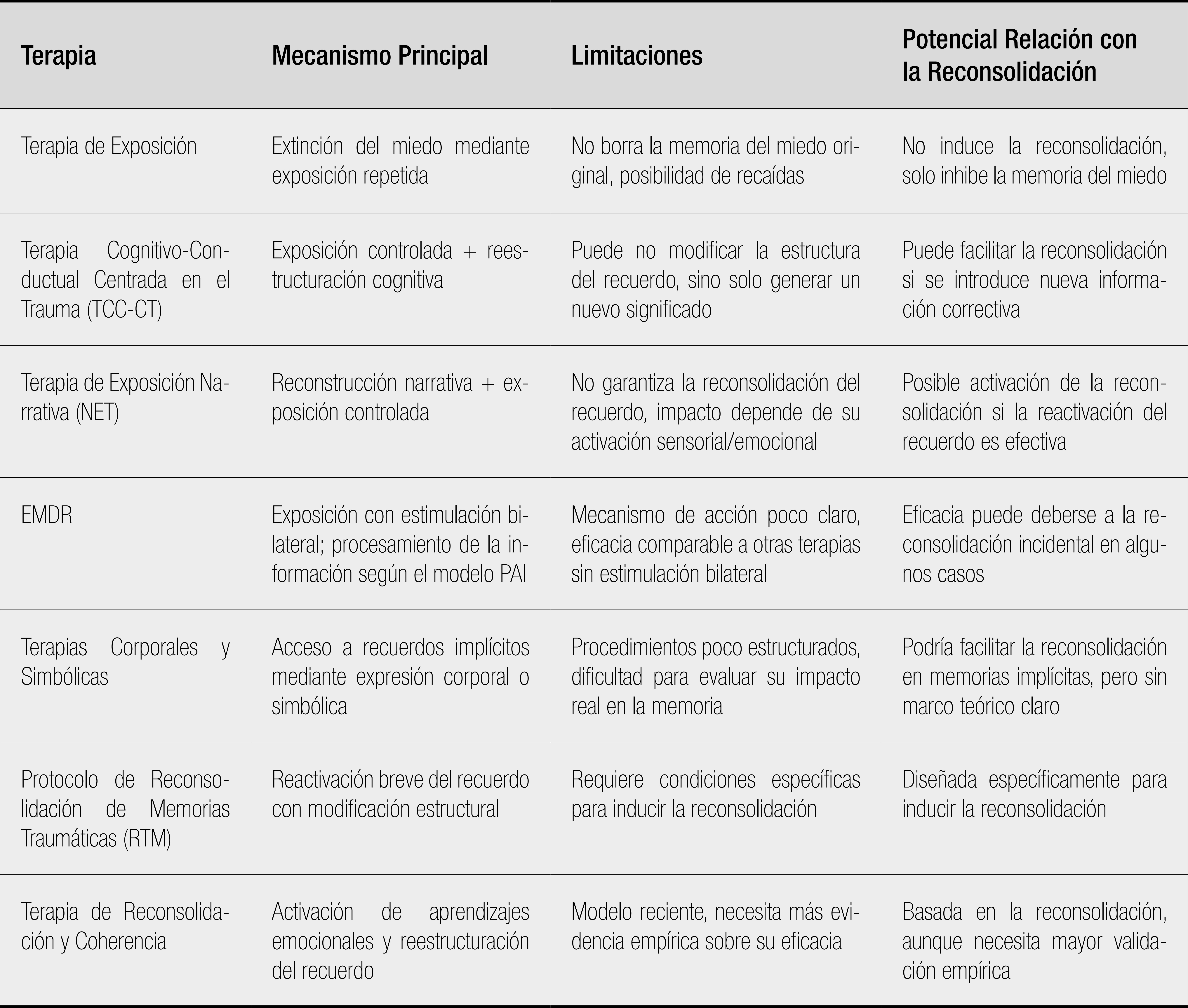 Memory reconsolidation may be a key mechanism in understanding therapeutic change, providing a possible comprehensive explanation of the efficacy of various trauma-focused psychological interventions. This study reviews the literature in this field, examining the principles of memory functioning relevant to therapy, with a particular emphasis on reconsolidation as a mechanism of change. A critique of established therapeutic models is presented, comparing reconsolidation with the theoretical foundations of traditional approaches such as exposure therapy and trauma-focused cognitive-behavioral therapy. Additionally, the study explores how certain approaches (e.g., eye movement desensitization and reprocessing [EMDR]) may incidentally facilitate this process without being explicitly designed for that purpose. Finally, opportunities for optimizing the integration of reconsolidation into clinical practice are highlighted, and future research directions for developing structured interventions based on this principle are proposed.