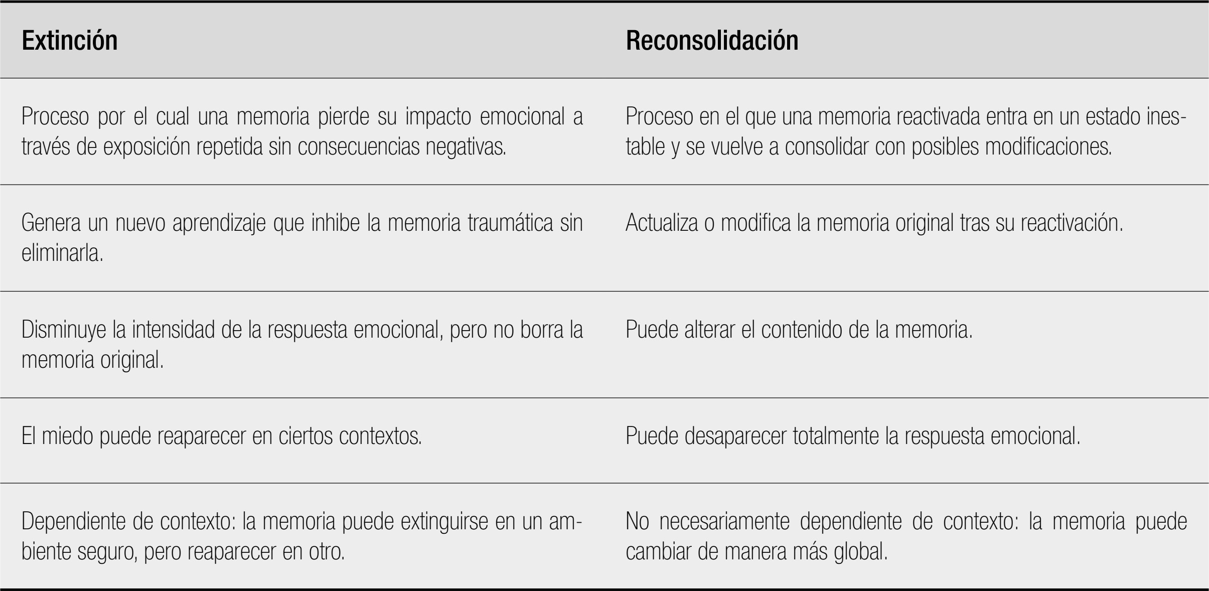 La reconsolidación de la memoria podría ser un mecanismo clave en la comprensión del cambio terapéutico, proporcionando una posible explicación transversal a la eficacia de diversas intervenciones psicológicas centradas en el trauma. Este artículo revisa la literatura en este campo, analizando los principios del funcionamiento de la memoria aplicables a la terapia, con especial énfasis en la reconsolidación como mecanismo de cambio. Se plantea una crítica a modelos terapéuticos establecidos, comparando la reconsolidación con los fundamentos de enfoques tradicionales como la exposición y la terapia cognitivo-conductual centrada en trauma. Además, se examina cómo algunos enfoques (EMDR por ejemplo) podrían estar facilitando parcialmente este proceso de manera incidental, sin haber sido diseñadas explícitamente con ese propósito. Se destacan oportunidades para optimizar la integración de la reconsolidación en la práctica clínica y se proponen futuras líneas de investigación para desarrollar intervenciones estructuradas basadas en este principio.