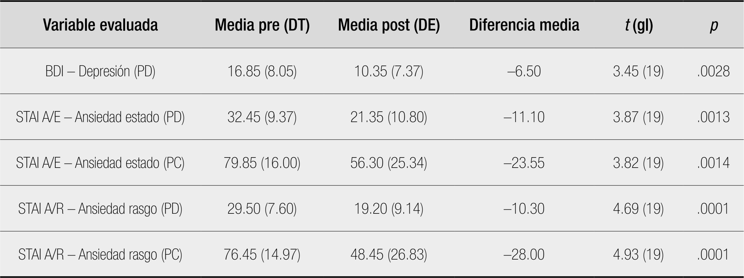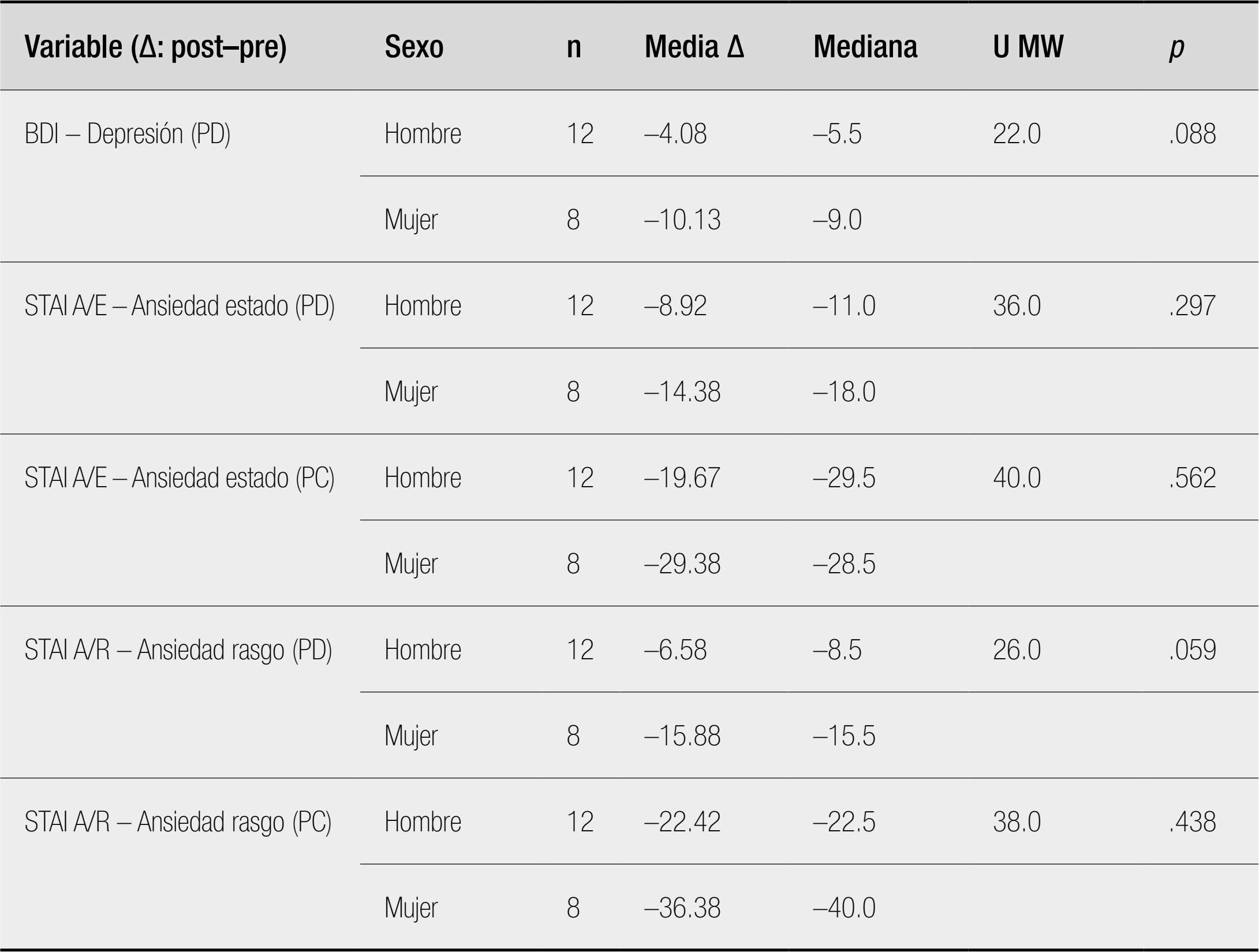 Tabla 5 Comparación pre-post intervención en síntomas de depresión y ansiedad (N = 20) Nota. PD = puntuación directa; PC = puntuación centil. BDI = Inventario de Depresión de Beck; STAI = Inventario de Ansiedad Estado-Rasgo; DT = desviación típica. Se utilizó la prueba t de Student para muestras relacionadas. Además de las diferencias estadísticamente significativas observadas a nivel grupal, se analizaron los cambios clínicamente relevantes a nivel individual. En la escala de depresión (BDI), 13 de los 20 pacientes (65 %) mostraron una reducción significativa de síntomas, entendida como un descenso clínicamente apreciable en la puntuación total. En la subescala de ansiedad estado (STAI A/E), 13 pacientes (65 %) evidenciaron una mejora individual, mientras que en la subescala de ansiedad rasgo (STAI A/R), 12 pacientes (60 %) presentaron reducciones clínicas tras la intervención. Estos resultados apoyan la relevancia clínica de la intervención más allá de los promedios estadísticos, mostrando que una proporción considerable de pacientes experimentó mejorías emocionales significativas en variables clave del malestar psicológico. Comparaciones por sexo En primer lugar, se analizaron las posibles diferencias por sexo en las puntuaciones de depresión y ansiedad antes y después de la intervención. Tal como se muestra en la Tabla 6, las mujeres presentaron puntuaciones significativamente más elevadas en depresión (BDI) en la evaluación preintervención (p = .049), mientras que tras la intervención no se observaron diferencias significativas entre sexos. Del mismo modo, no se encontraron diferencias significativas en las medidas de ansiedad estado ni ansiedad rasgo, en los momentos pre ni postintervención, si bien las mujeres tendieron a mostrar valores medios ligeramente superiores. En conjunto, ambos grupos mostraron una disminución general de los niveles de depresión y ansiedad tras la intervención, alcanzando valores posintervención similares entre hombres y mujeres. Se realizaron análisis no paramétricos (prueba de Mann-Whitney U) para explorar posibles diferencias por sexo en la magnitud de mejora en depresión y ansiedad tras la intervención. En relación con la depresión, las mujeres presentaron una reducción más pronunciada en la puntuación directa del BDI (Δ = –10.13; DE = 8.59) que los hombres (Δ = –4.08; DE = 7.82), observándose una tendencia hacia la significación (U = 22.0; p = .088). En cuanto a la ansiedad estado (STAI A/E), tanto en puntuaciones directas como centiles, se observaron mejoras en ambos sexos, con reducciones algo mayores en mujeres (Δ PD = –14.38; Δ PC = –29.38) en comparación con hombres (Δ PD = –8.92; Δ PC = –19.67). No obstante, estas diferencias no fueron estadísticamente significativas (p = .297 y p = .562, respectivamente). Para la ansiedad rasgo (STAI A/R), también se observaron descensos más acusados en mujeres. En la puntuación centil, las mujeres mostraron una mejora media de Δ = –36.38 (DE = 16.26) frente a Δ = –22.42 (DE = 30.11) en hombres (p = .438). En cuanto a la puntuación directa, la diferencia entre sexos fue más notable (Δ mujeres = –15.88 vs. Δ hombres = –6.58), con una tendencia cercana a la significación (U = 26.0; p = .059). Los resultados de este estudio indican que la inclusión de una intervención psicológica en el marco de un programa de rehabilitación cardíaca puede producir mejoras clínicas significativas en el estado emocional de los pacientes. En esta muestra se observaron reducciones estadísticamente significativas tanto en los niveles de ansiedad como en los de depresión, evaluados a través del Inventario de Depresión de Beck (BDI) y el Inventario de Ansiedad Estado-Rasgo (STAI). Estos hallazgos coinciden con investigaciones previas que han documentado la eficacia de las intervenciones psicológicas en la población cardíaca (Fernández Abascal et al. 2003, Linden et al., 1996; Reavell et al., 2018, Valls Lázaro, 2021, Moreno Monzó et al. 2024). Una de las principales fortalezas del presente estudio es la inclusión de un componente de intervención individual, además del formato grupal tradicional. Si bien las intervenciones grupales han demostrado ser eficaces para la mejora del estado emocional y la adherencia en pacientes cardíacos (Reavell et al., 2018; Blumenthal et al., 2016), la atención individualizada representa una aportación innovadora y adaptativa dentro del contexto hospitalario de la rehabilitación cardíaca. La intervención psicológica individual permite abordar en mayor profundidad las necesidades clínicas específicas de los pacientes que presentan sintomatología ansioso-depresiva significativa, así como factores de riesgo psicosocial que requieren un enfoque más personalizado (Grace et al., 2002). Este formato facilita la creación de una alianza terapéutica sólida, posibilita el abordaje de aspectos más íntimos y complejos, y permite ajustar los objetivos terapéuticos y el ritmo de intervención en función de las características individuales (Wulsin et al., 2015). En particular, se ha observado que los pacientes con antecedentes de salud mental, traumas, o dificultades para participar activamente en grupos, pueden beneficiarse más de un enfoque individual, lo cual puede ser clave para reducir el riesgo de abandono del programa (Clark et al., 2005; Freedland et al., 2015). Además, el tratamiento individual permite realizar intervenciones más intensivas en aspectos como la reestructuración cognitiva, la regulación emocional, el afrontamiento del estrés o la adherencia farmacológica, los cuales están estrechamente relacionados con la evolución clínica (Magán et al., 2022). En nuestra experiencia, a lo largo de las sesiones de intervención individual se detectó la presencia de un impacto psicológico importante tras el evento cardíaco, ansiedad anticipatoria al acudir, por ejemplo, a la