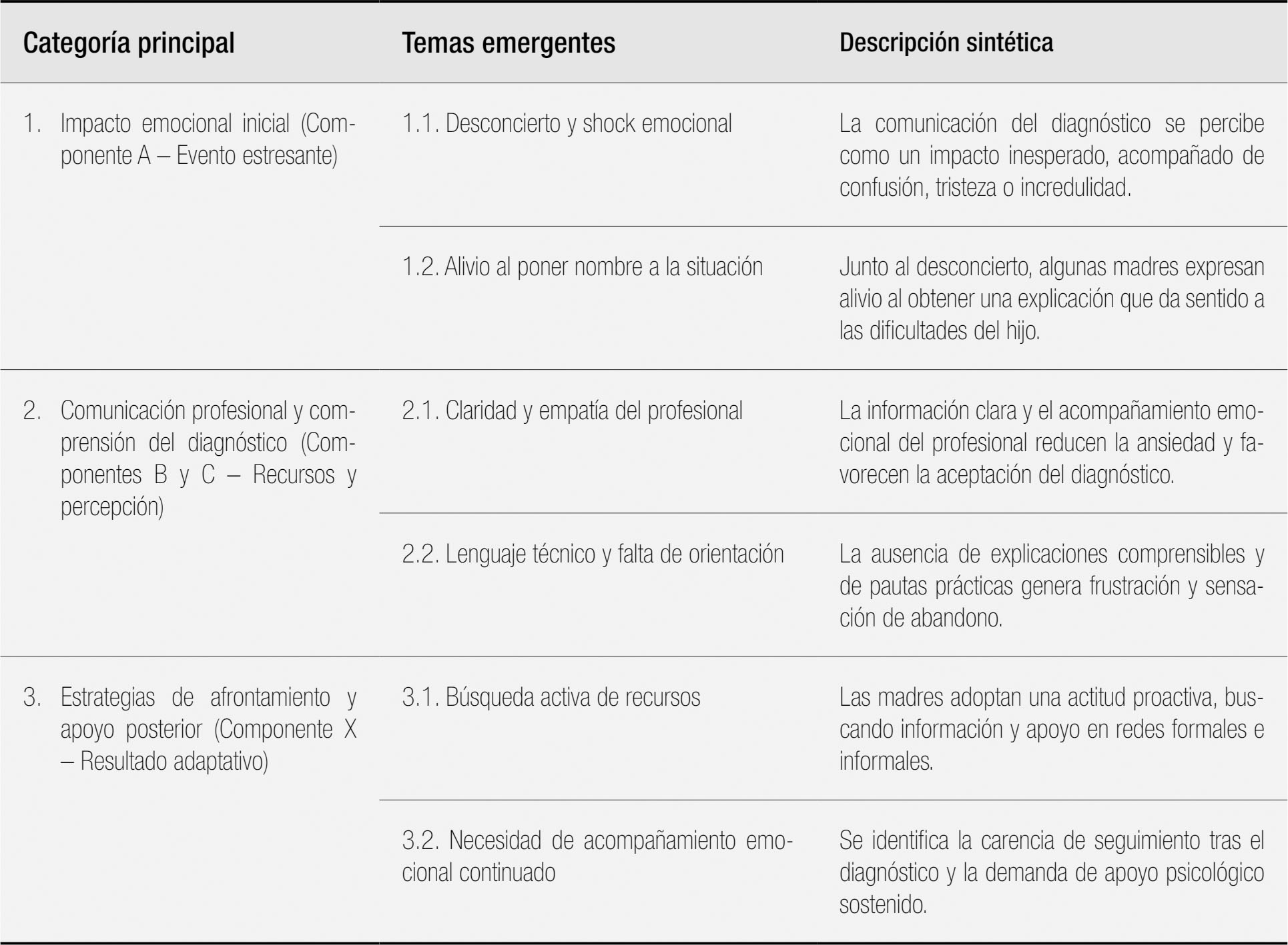 El objetivo principal de este estudio es describir y analizar cuantitativamente las experiencias de un grupo de madres de niños diagnosticados con autismo en edades tempranas, específicamente entre los 0 y 6 años, así como comparar dichas experiencias en función del tipo de profesional que comunicó el diagnóstico (psicólogos frente a otros profesionales de la salud, como pediatras, neuropediatras o psiquiatras). En particular, este estudio se propone identificar las emociones predominantes, las estrategias de afrontamiento empleadas por las madres y los recursos que consideran más efectivos para sobrellevar el proceso inicial, teniendo en cuenta las posibles diferencias derivadas del perfil profesional de quien comunicó el diagnóstico. La hipótesis que orienta el estudio plantea que, aunque las madres experimentan altos niveles de estrés y emociones intensas, la presencia de redes de apoyo familiares, profesionales y sociales puede mitigar de forma significativa el impacto emocional, contribuyendo a una adaptación más positiva a la nueva situación. Además, se espera que una comunicación clara y empática por parte de los profesionales de salud facilite la aceptación del diagnóstico y la disposición para emprender intervenciones adecuadas. En este estudio, el evento estresante es el diagnóstico de autismo, los recursos incluyen tanto los aspectos individuales y familiares como el apoyo social y profesional, la percepción se refiere a cómo las madres interpretan y atribuyen significado a la noticia del diagnóstico, y el resultado final corresponde al grado de adaptación o crisis que experimenta la familia. El uso del modelo ABCX en este estudio es particularmente pertinente, ya que permite explorar cómo las madres enfrentan emocionalmente el diagnóstico de autismo, y cómo sus recursos personales, el apoyo social y sus percepciones del trastorno influyen en su capacidad para ajustarse a esta nueva realidad. Además, el modelo facilita un análisis detallado de las respuestas emocionales inmediatas y los procesos de adaptación a largo plazo, aspectos fundamentales para comprender el impacto del diagnóstico en las madres de niños y niñas con TEA. El presente estudio adopta un diseño mixto de tipo cuantitativo-descriptivo y cualitativo-inductivo. El componente cuantitativo permitió identificar tendencias generales en las respuestas (frecuencias y porcentajes), mientras que el componente cualitativo buscó profundizar en las experiencias subjetivas de las madres ante la comunicación del diagnóstico. Esta combinación de análisis descriptivo y temático permitió integrar los datos cuantitativos con las narrativas cualitativas, aportando una visión más rica y contextualizada de la experiencia de las madres. Participantes El estudio se centró en 50 madres de niños con diagnóstico de TEA en edades comprendidas entre los 0 y los 6 años. Todas las participantes residen en la Comunidad de Madrid, lo que permite una representación de la realidad local de esta región. Las entrevistas se realizaron de manera individual y exclusivamente con las madres, sin participación conjunta de los padres, con el fin de recoger sus vivencias personales ante la comunicación diagnóstica. Las madres seleccionadas para participar fueron aquellas que habían recibido la primera noticia del diagnóstico de autismo de sus hijos/as dentro de los dos años previos al inicio de la investigación, garantizando así que su testimonio estuviera vinculado a una experiencia reciente y relevante. En cuanto a los criterios de inclusión, se consideraron a las madres de niños diagnosticados formalmente con TEA, utilizando criterios del DSM-5 y/o la prueba ADOS-2 (Autism Diagnostic Observation Schedule, Second Edition), ampliamente reconocidos como los estándares de diagnóstico para el trastorno (American Psychiatric Association, 2013; Lord et al., 2024). Se excluyeron del estudio las madres cuyos hijos/as no tuvieran un diagnóstico de TEA formalmente establecido mediante los procedimientos diagnósticos reconocidos (DSM-5 o ADOS-2). Se excluyeron aquellas madres con niños/as diagnosticados con otros trastornos del neurodesarrollo que pudieran interferir en la interpretación de las experiencias relacionadas exclusivamente con el TEA, así como aquellas madres que no estuvieran dispuestas a participar o que no pudieran comunicar sus experiencias de manera efectiva, ya sea por barreras lingüísticas o por razones de salud. Respecto a las características demográficas, la media de edad de las madres fue de 34.6 años, con un rango de 31 a 44 años. En cuanto a los niños, la media de edad fue de 3.8 años, con un rango de 1.2 a 6 años. La edad media en el momento del diagnóstico fue de 3,2 años, con un rango de 2 a 5 años, coincidiendo con la etapa preescolar y los primeros años de escolarización, momento habitual en el que las familias reciben la primera valoración formal. En relación con los profesionales y contextos diagnósticos, el 40% de las madres indicó que el diagnóstico fue comunicado por un/a psicólogo/a, mientras que el 60% restante lo recibió de otros profesionales sanitarios, como pediatras, neuropediatras o psiquiatras. Entre los psicólogos/as, la mayoría pertenecían a equipos específicos de autismo en centros públicos o concertados, o a gabinetes privados especializados en evaluación del desarrollo. En el caso de los otros profesionales, la comunicación diagnóstica tuvo lugar principalmente en hospitales generales o centros de salud, en el marco de consultas médicas especializadas. Esta diversidad de entornos permitió explorar cómo las diferencias en la formación y el protocolo comunicativo de cada disciplina pueden influir en la experiencia de las familias. Instrumentos Para la recogida de datos, se utilizaron entrevistas estructuradas y semiestructuradas, herramientas que permitieron obtener una visión detallada y contextualizada de las exp